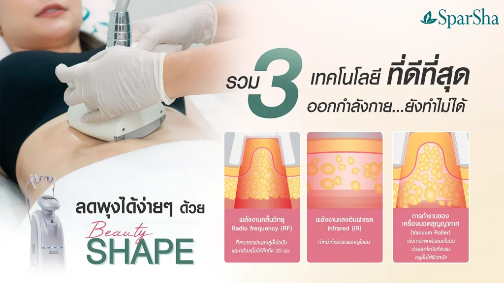 สำหรับใครที่อยากลดพุงอย่างเร่งด่วน อาจจะไม่มีเวลาออกกำลังกาย หรืออาจจะควบคุมอาหารไม่ได้มากนัก อีกหนึ่งเคล็ดลับที่จะช่วยลดพุงได้ง่ายๆ ด้วยการเลือกใช้บริการคลินิกเสริมความงามกับโปรแกรม Beauty Shape by SparSha ก็ได้เช่นกัน โดยโปรแกรมนี้จะช่วยให้สัดส่วนหรือหน้าท้องแบนราบลงอย่างเห็นได้ชัด ซึ่งจะเป็นการใช้นวัตกรรมทางการแพทย์ 3 พลังงานในเครื่องเดียว จึงช่วยสลายไขมันแบบเร่งด่วน พร้อมลดปริมาณไขมันบริเวณหน้าท้อง ต้นขา โดยที่ไม่ต้องผ่าตัด และช่วยฟื้นฟูระบบการเผาผลาญเฉพาะส่วนได้ดี ซึ่ง 3 เทคโนโลยีของโปรแกรม Beauty Shape มีดังนี้